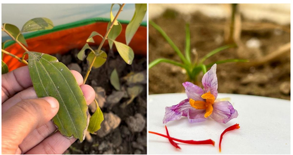 Along with medicinal herbs like ashwagandha, basil, and oregano, she grows 15 kinds of spices— including turmeric, black pepper, saffron, cloves, nutmeg, fennel, fenugreek, bay leaf, cinnamon, asafoetida, allspice plant (kabab chini), chilli, coriander, nigella sativa plant (kalonji), and cardamom.