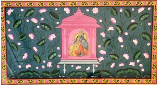 Inspired by the popular theme of kamal talai (“lotus pond”) this pichvai shows Krisha wooing his beloved Radha in a vibrant pink chhatri surrounded by luscious lotus blossoms along the banks of the Yamuna River.