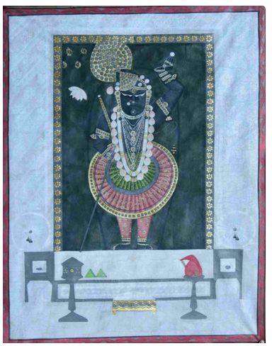 The painting depicts the shringar (adornment) of Shrinathji. Gol Kachni shringar of Shrinathji is done once a year on Ashvin Shukla Ekadashi. Here he is depicted donning elegant gold ornaments and an elaborately trimmed and elegant dress.