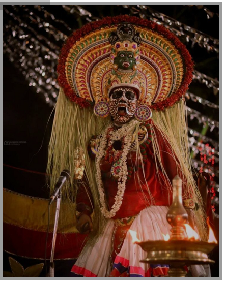 Kalampuja follows in which the drawing is worshipped based on the belief that the deity’s spirit is now in it. The drawing is then erased and the performers gather in avatars of the deity, the demon Darika, and other characters. As percussion instruments ring into the night silence, the performance ensues.